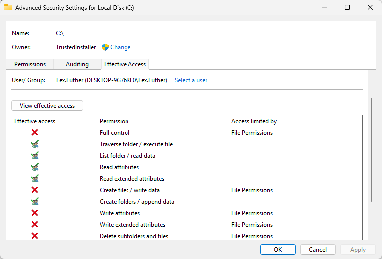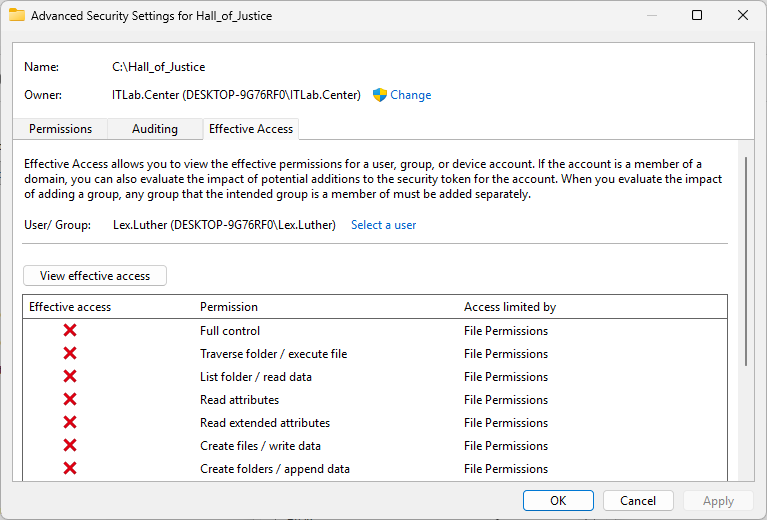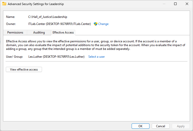 Navigate to This PC, then use the Effective Access tool to check Lex Luthers permissions for C:\: