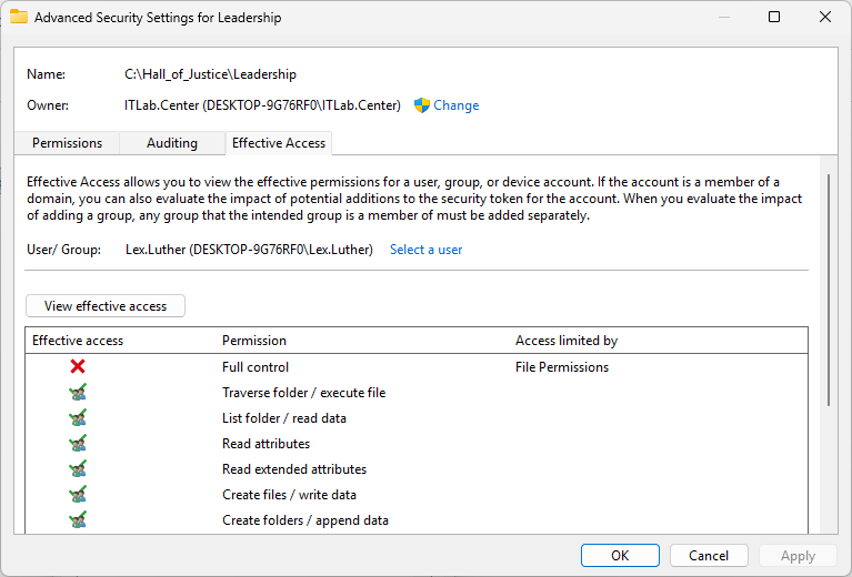 Notice that the Lex.Luther account has many permissions to the Leadership folder and its contents