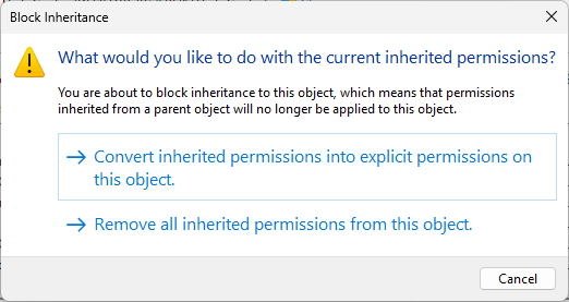 Note that when disabling inheritance, you must either copy the existing rules or begin from scratch