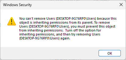 Now repeat the previous steps above and attempt to remove the Users and Authenticated Users groups
