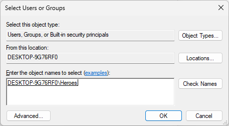 In the Select Users or Groups window, type Heroes into the Enter the object names to select field