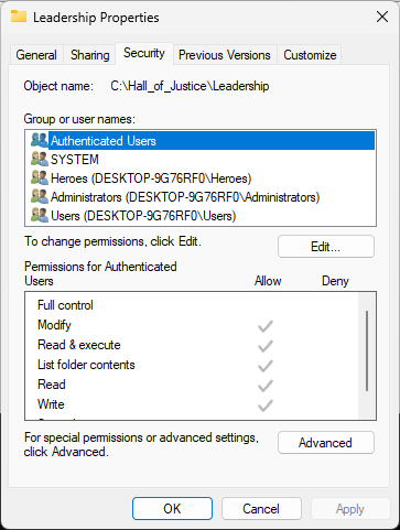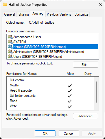 Head back to the Hall_of_Justice folders Properties Window and the Security tab, then click Advanced
