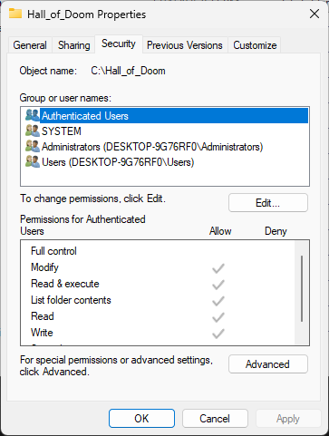 In the Hall_of_Doom Properties window, click the Edit button option to open the Permissions window