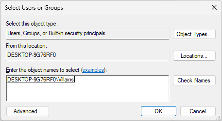 In the Select Users or Groups window, type Villains into the Enter the object names to select field