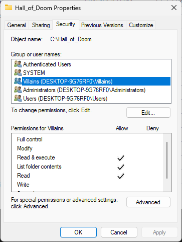 From the Permissions window, click on apply, then click okay, ensure Villains has Read and Execute: