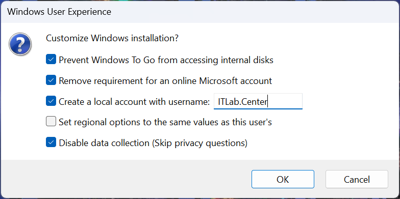Use the rufus popup menu to customize the Windows 11 Live installation and disable data collection for this lab: