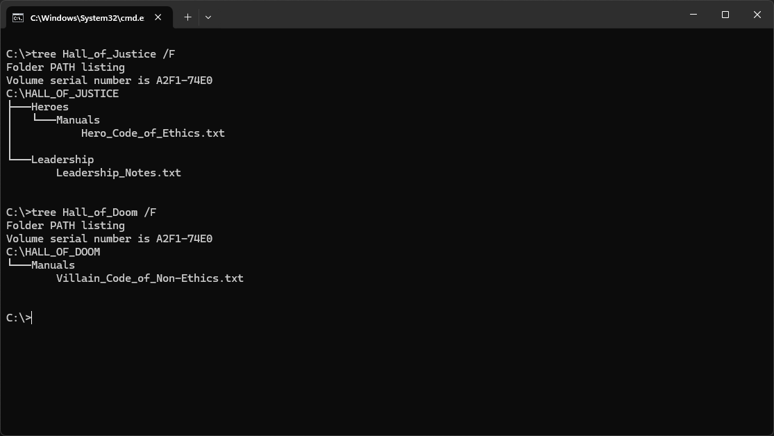 C:\>echo. > C:\Hall_of_Justice\Heroes\Manuals\Hero_Code_of_Ethics.txt C:\Hall_of_Justice\Leadership\Leadership_Notes.txt C:\Hall_of_Doom\Manuals\Villain_Code_of_Non-Ethics.txt