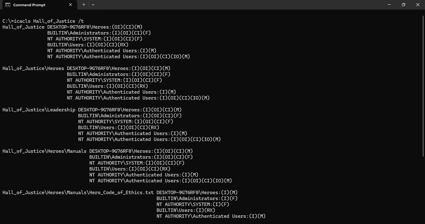 Run the following command from the Command Prompt to see all permissions in the Hall_of_Justice tree: