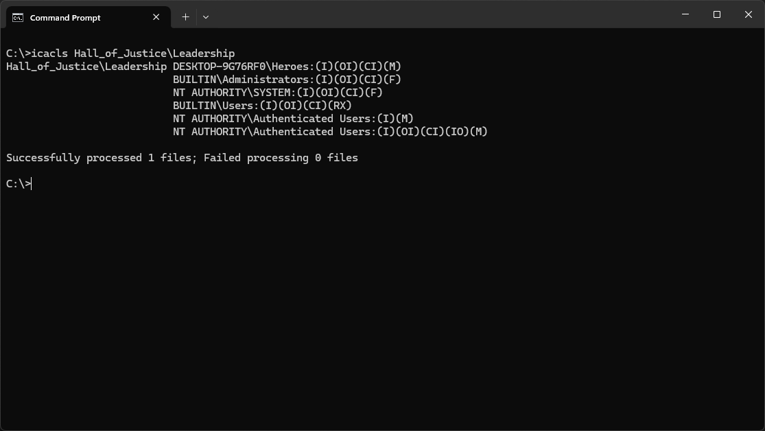 In the output above, notice that the Heroes group has Modify (M) permission that was inherited (I)