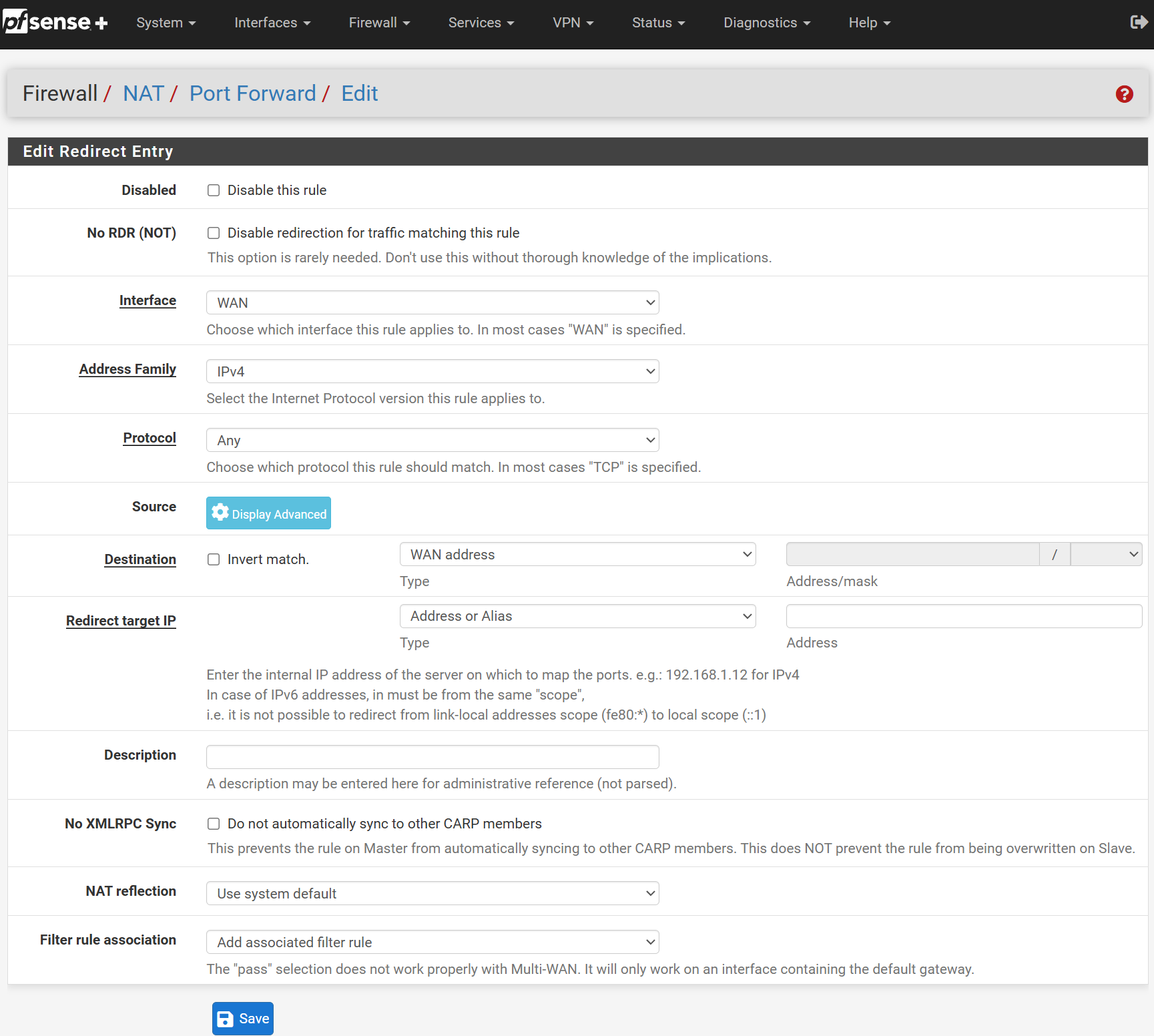 Once configured use the top menu to head to Firewall > NAT > Port Forward then click the green Add