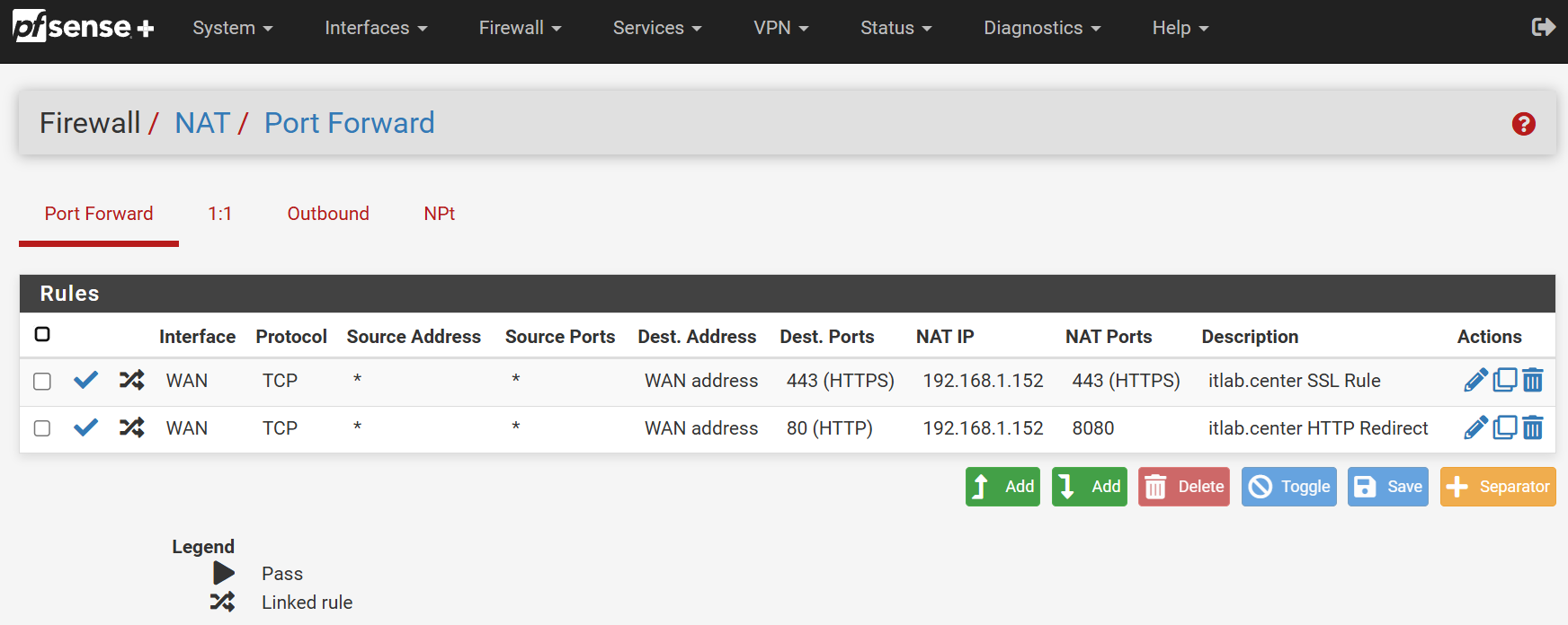 Apply the configuration and reload, while we are here let's also forward port 443 for HTTPS:
