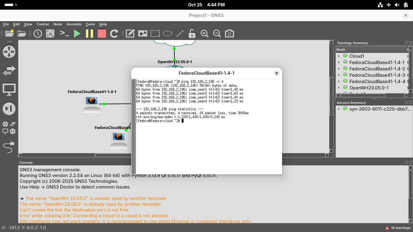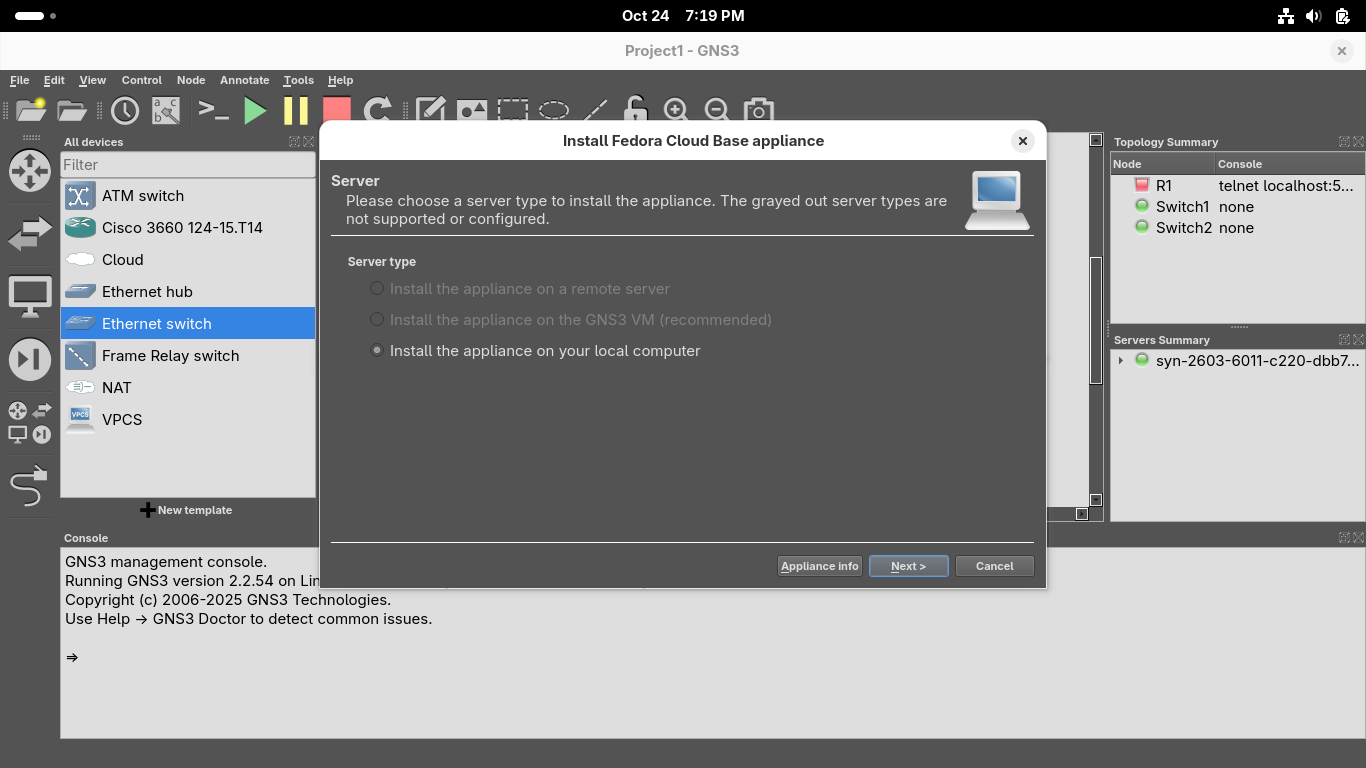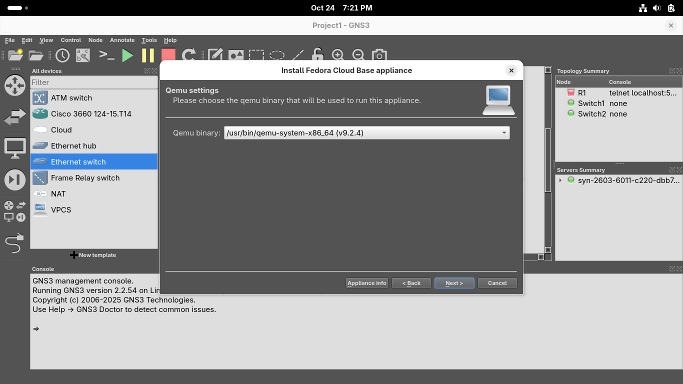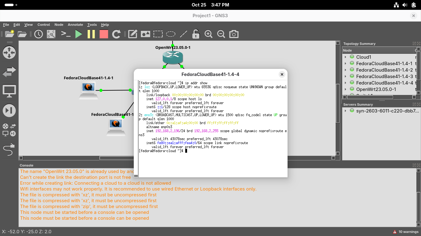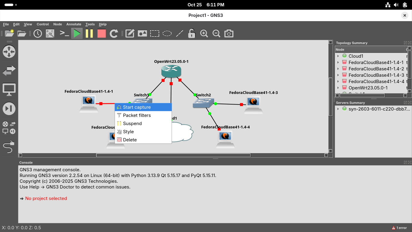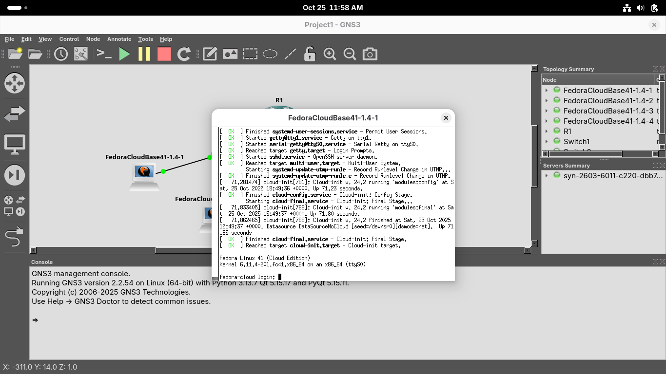 From the GNS3 topology window, right-click FedoraCloudBase41-1.4-1 and select the Console option: