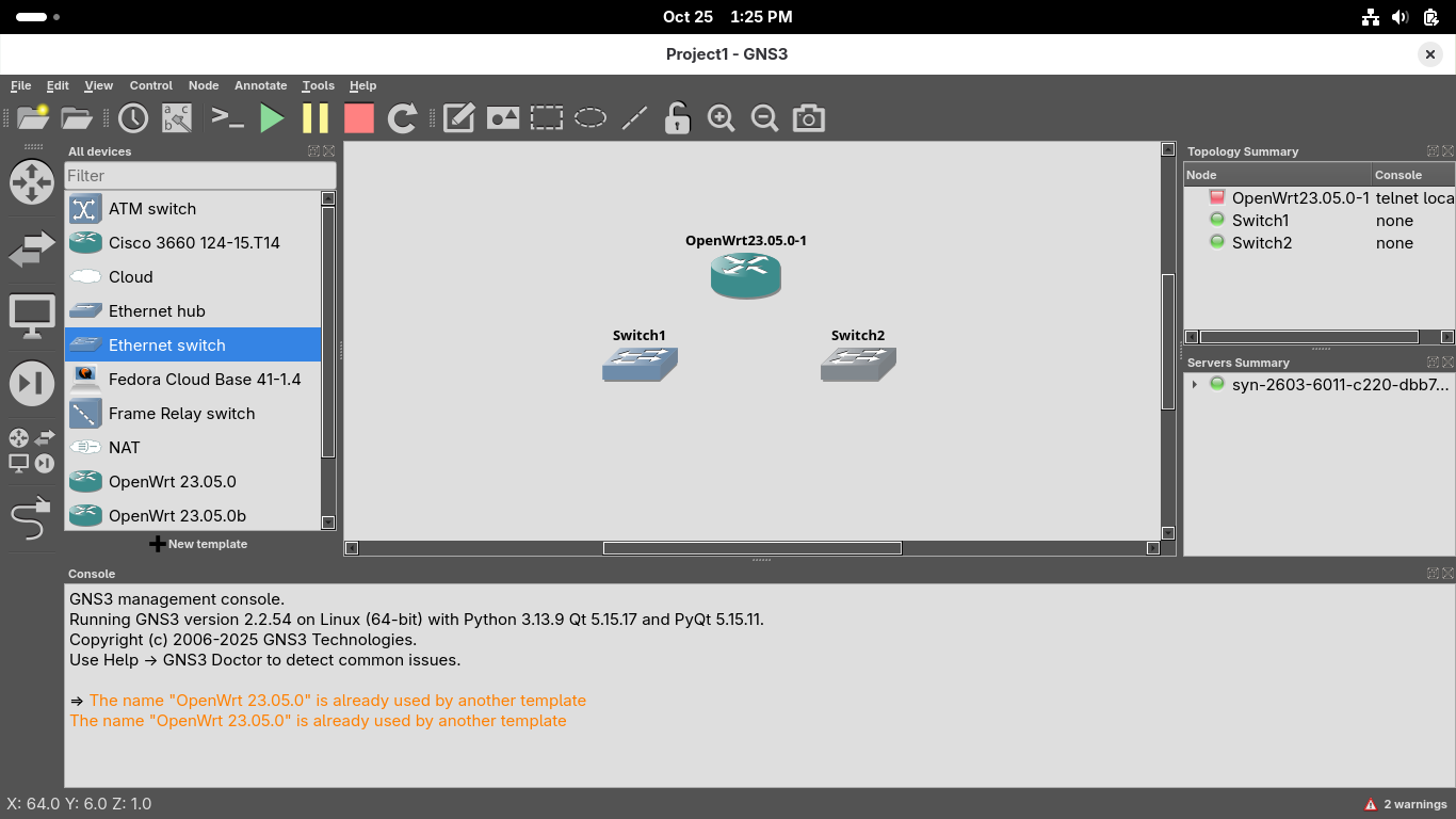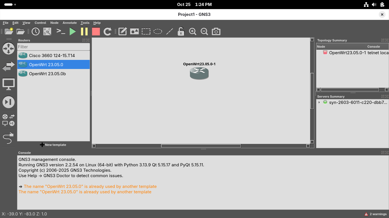 Right click on the OpenWRT23.05.0-1 router and select the console option, allow the system to load