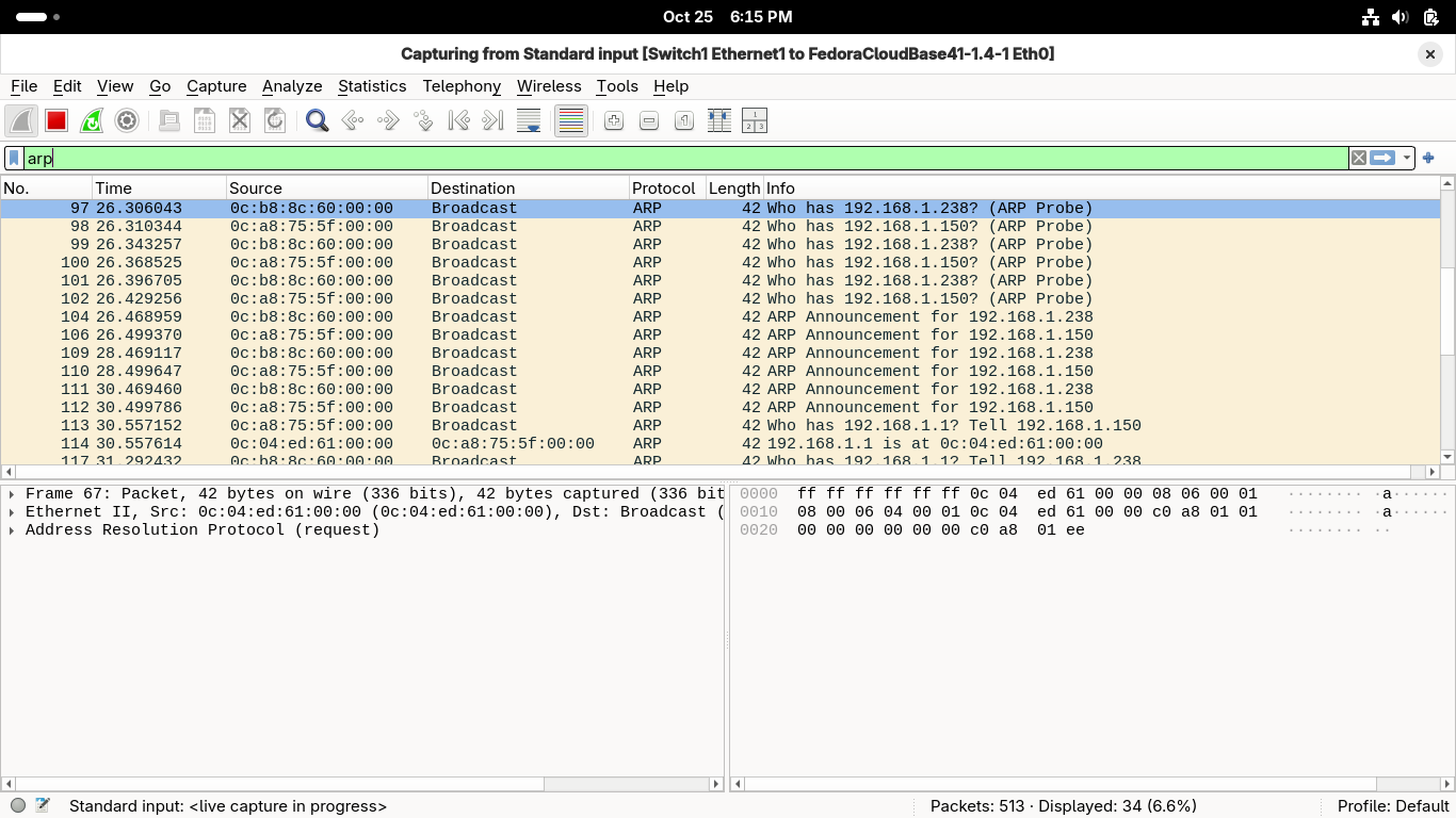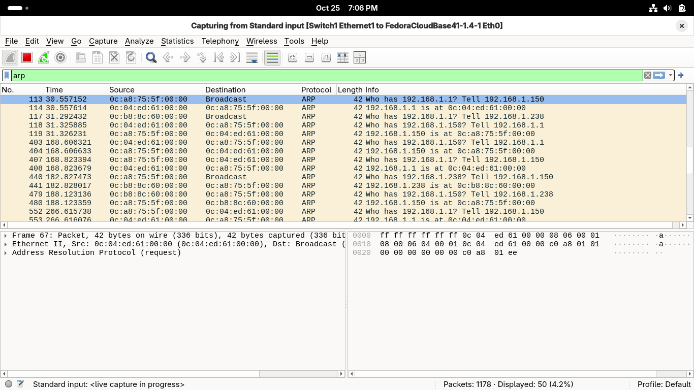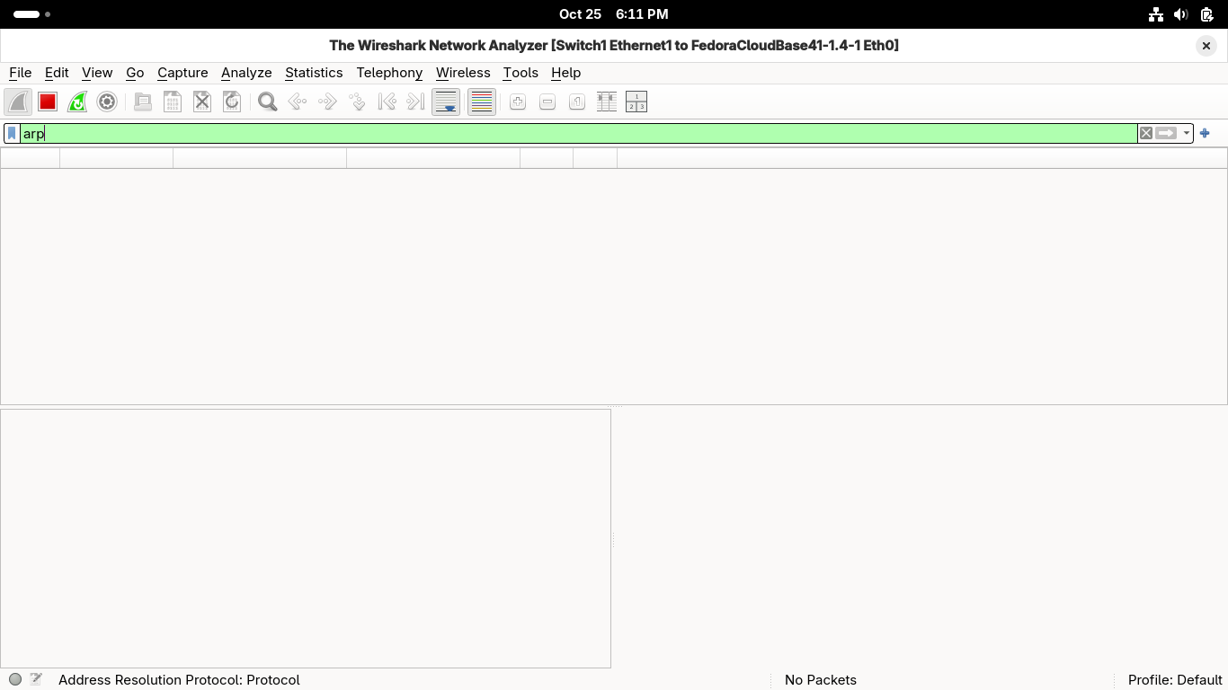 We are now capturing packets on the link, type 'arp' in the wireshark display filter field above: