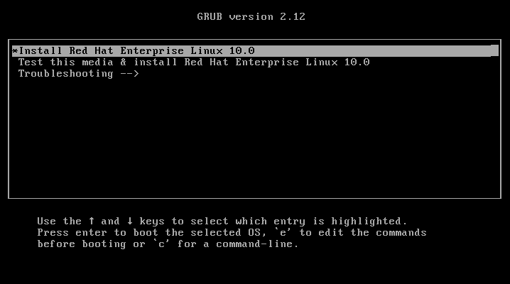 You will be greeted with the GRUB bootloader screen, select the option to Install Red Hat Linux v10.0: