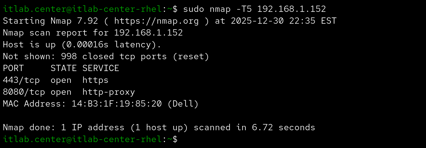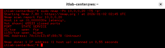 itlab-center@ws:/# sudo nmap -Pn 10.0.0.20 -T5 -p-