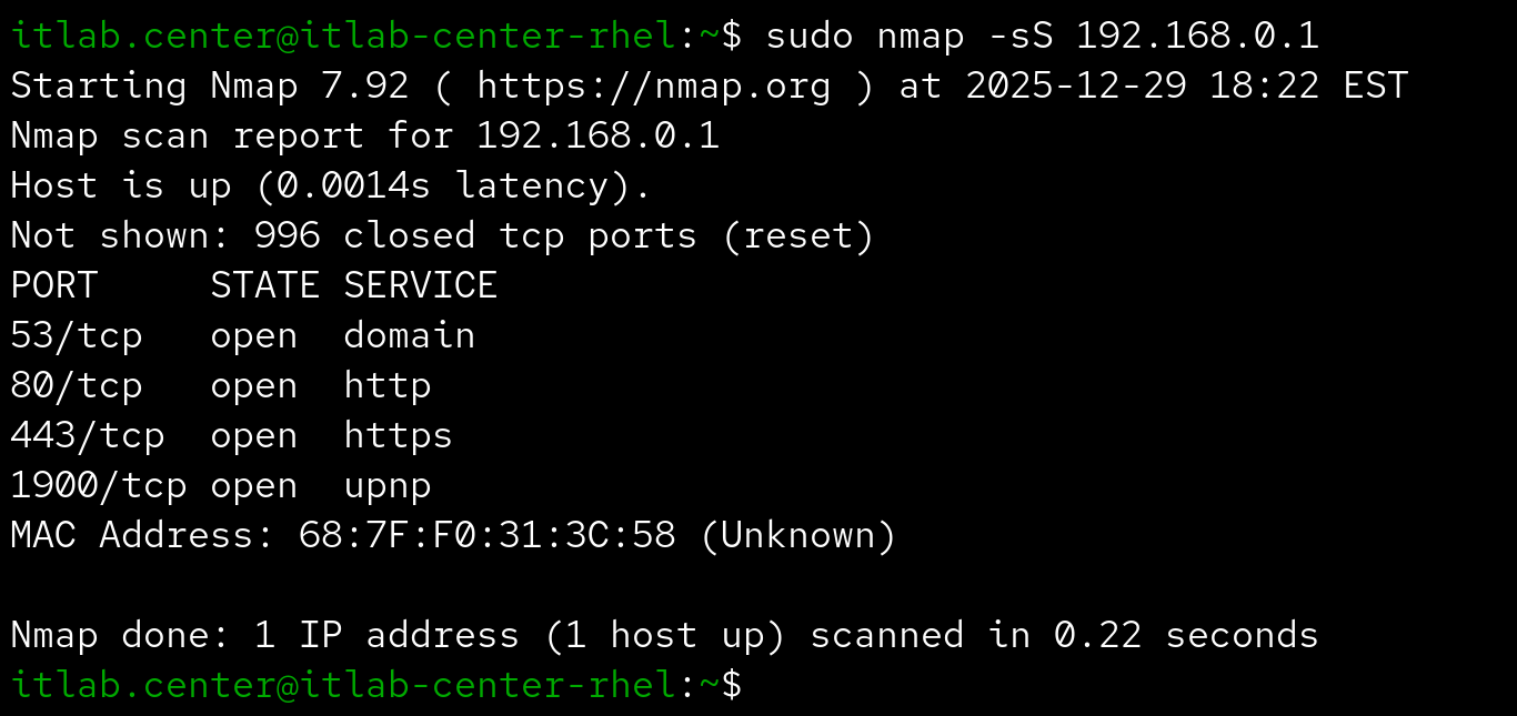 This is the default scan if running Nmap with root privileges, so the following command is equivalent: