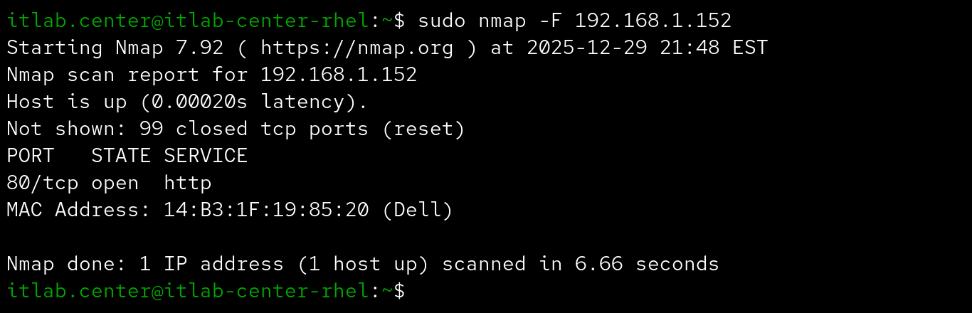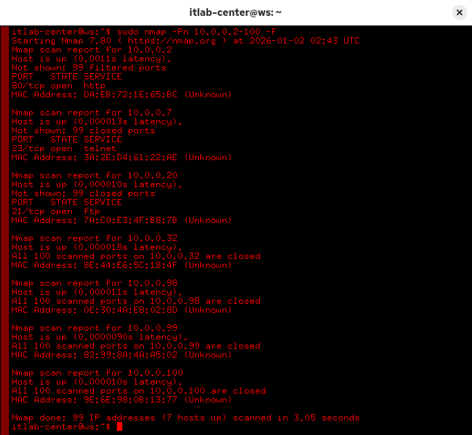 itlab-center@ws:/# sudo nmap -Pn 10.0.0.2-100 -F