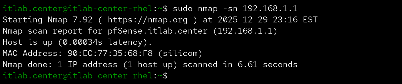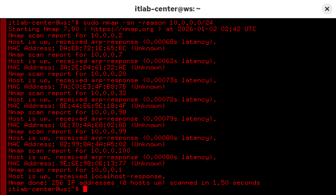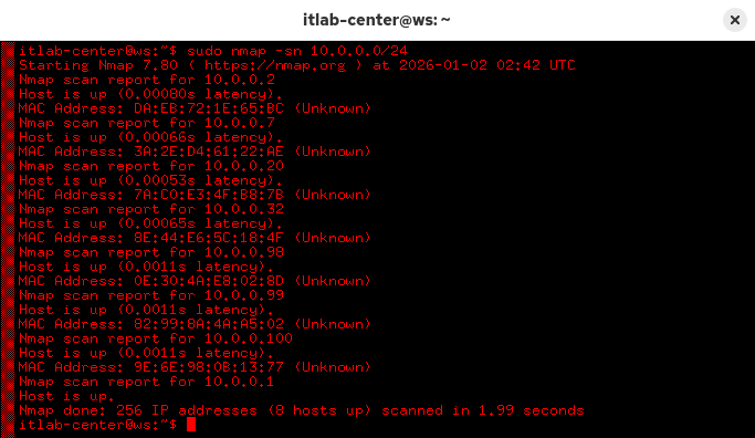 itlab-center@ws:/# sudo nmap -sn 10.0.0.0/24