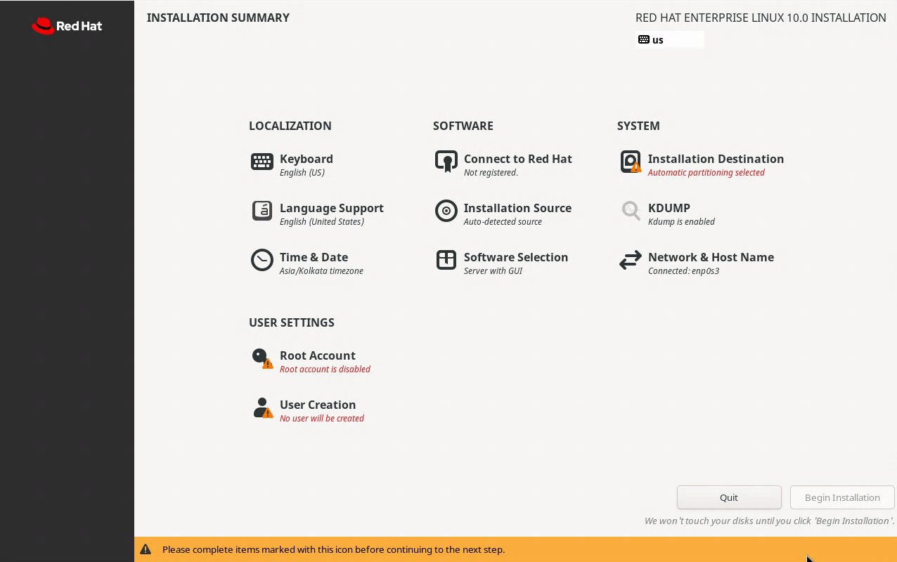 Under the Software Settings, click the option to Connect to Red Hat to allow for software installation