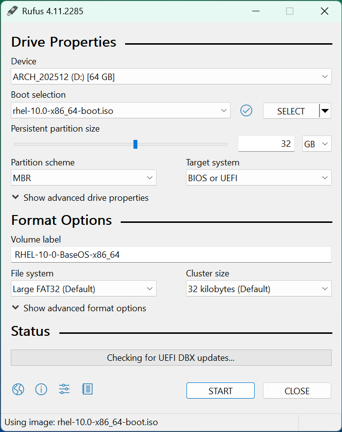 Insert USB Flash Drive, run rufus.exe, select target drive as your USB Flash Drive, select RHEL 10.0 ISO: