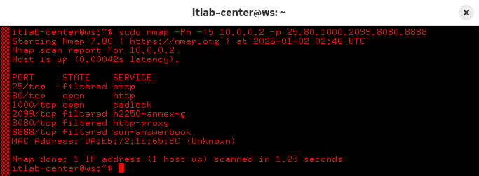 itlab-center@ws:/# sudo nmap -Pn -T5 10.0.0.2 -p 25,80,1000,2099,8080,8888