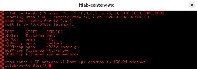 itlab-center@ws:/# nmap -Pn -T1 10.0.0.2 -p 25,80,1000,2099,8080,8888