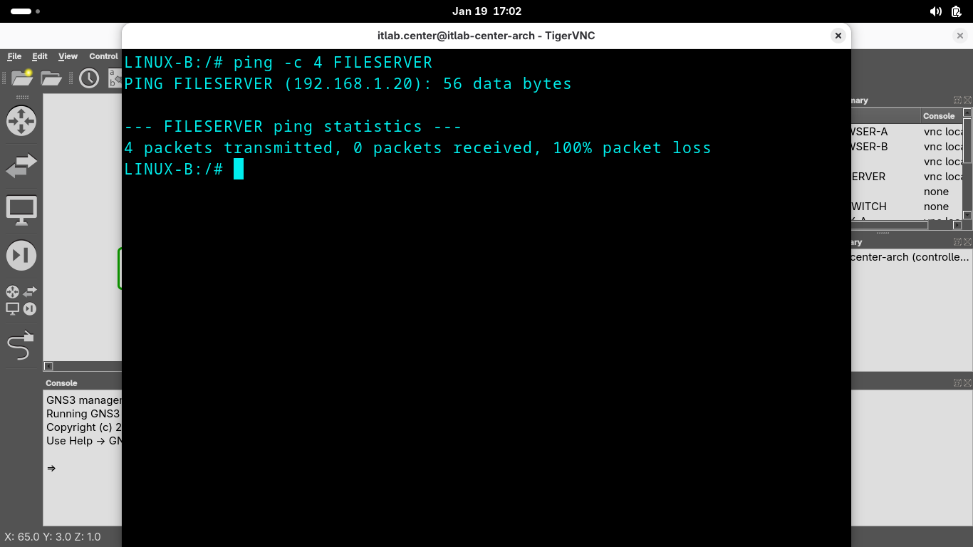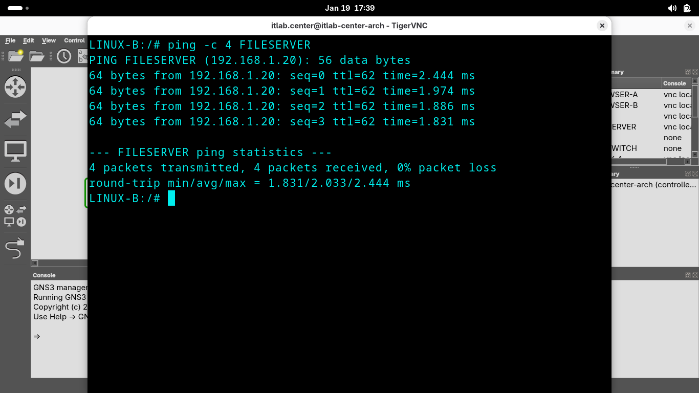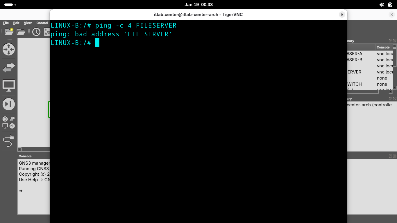 Run the following command from the GNS3 LINUX-B Console Terminal to test connectivity to the FILESERVER: