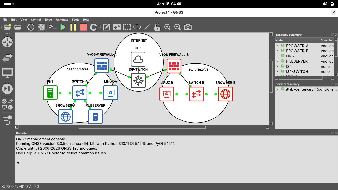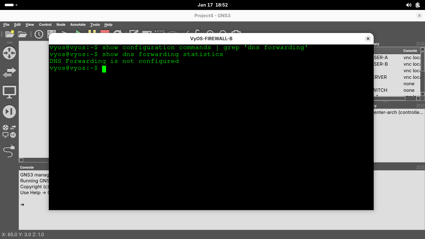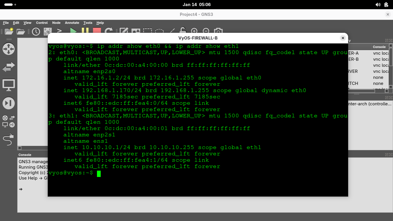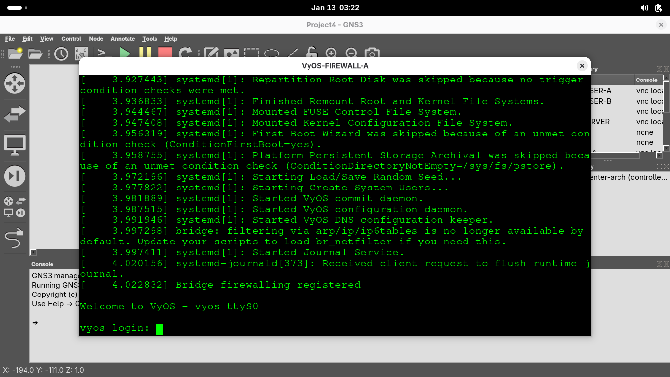 Right click the VyOS-FIREWALL-A appliance and select console to restore the firewall appliances terminal