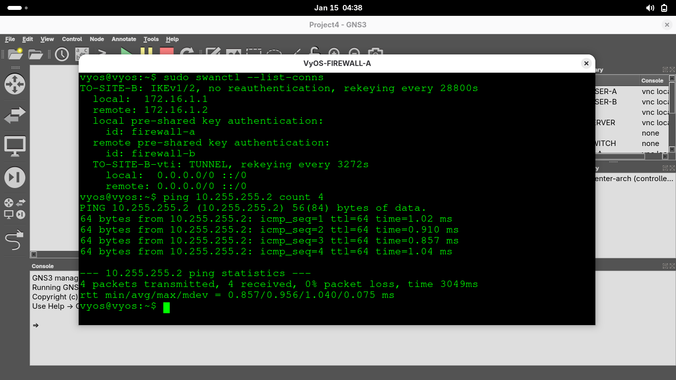 It's time to check the dreaded IPsec VPN tunnel. This should be configure on each of our VyOS Firewalls