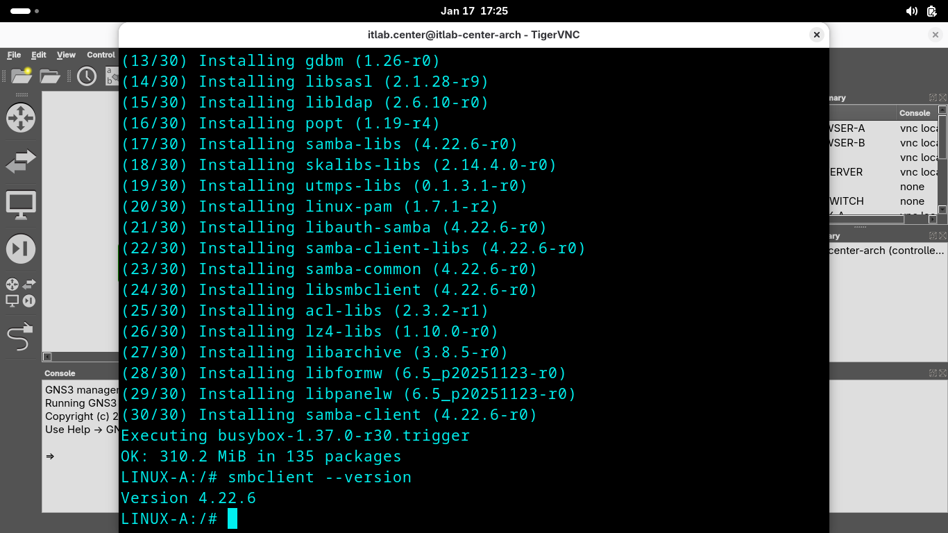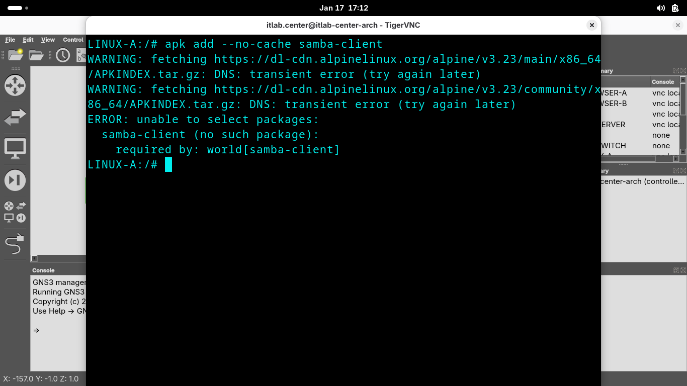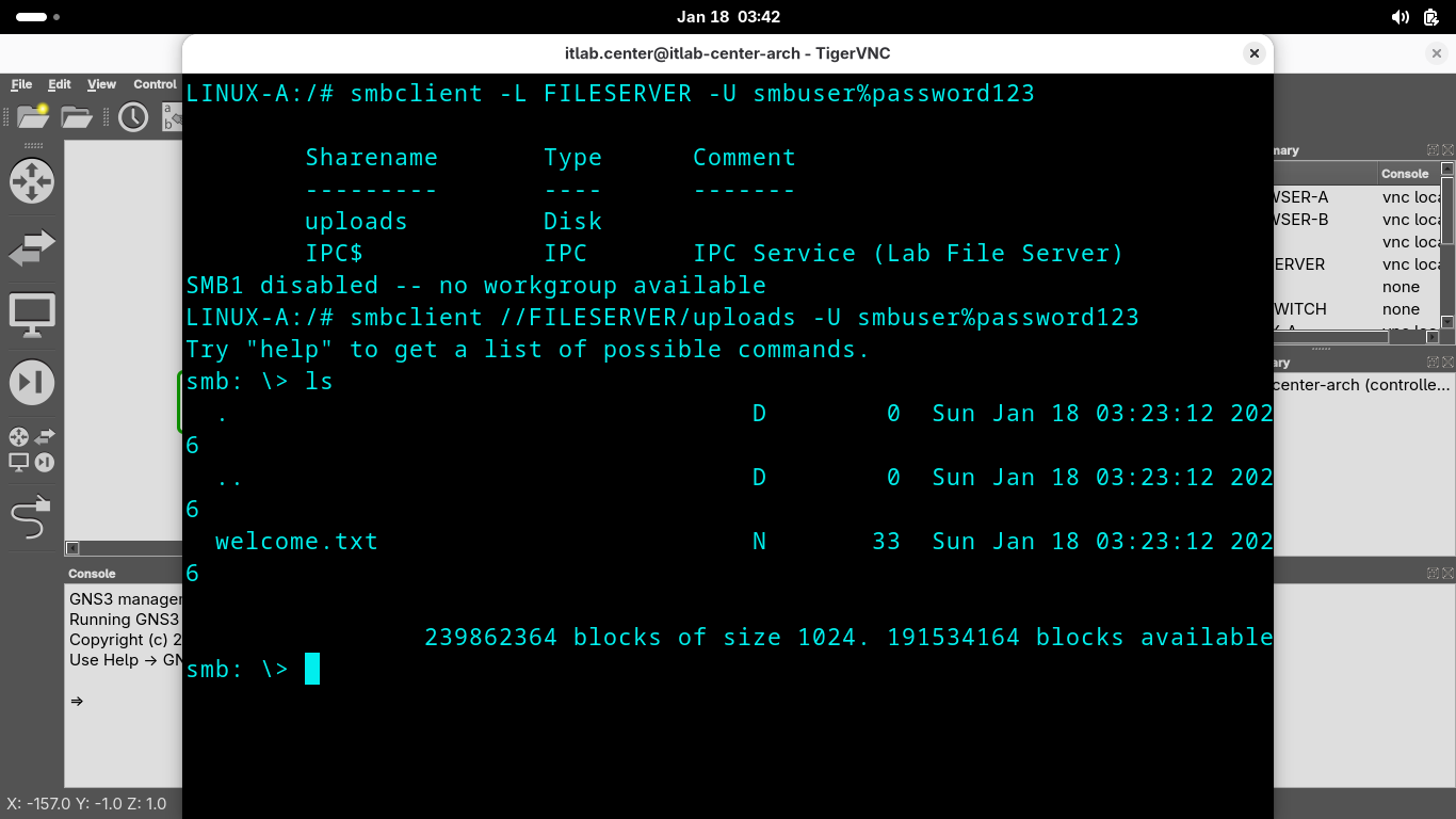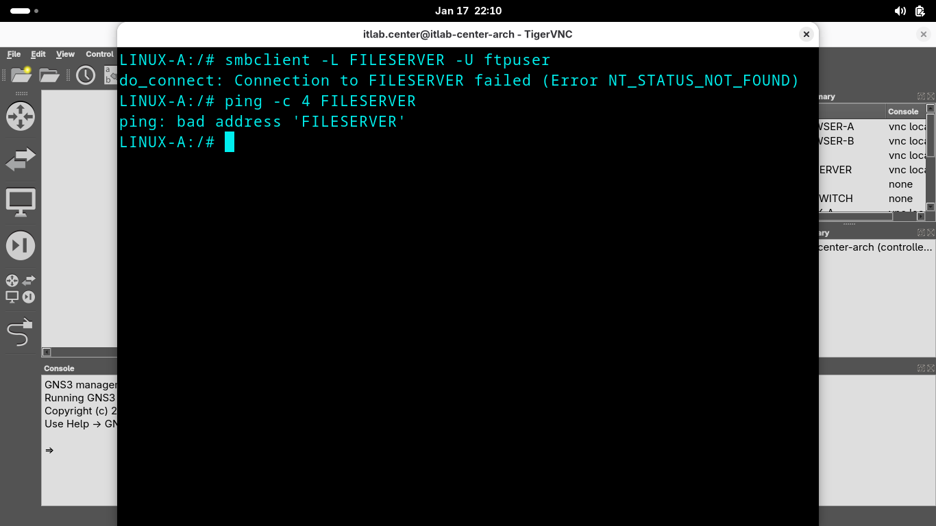 Run the following commands from the GNS3 LINUX-A Console Terminal to list the available smb shares again: