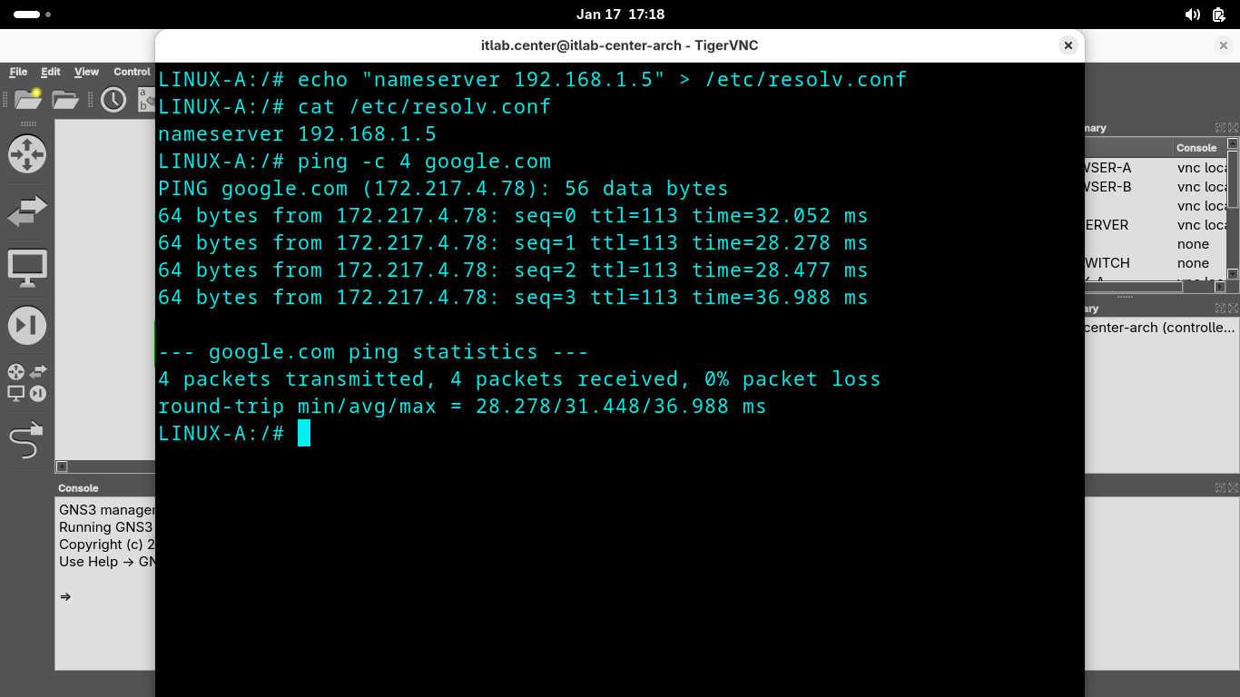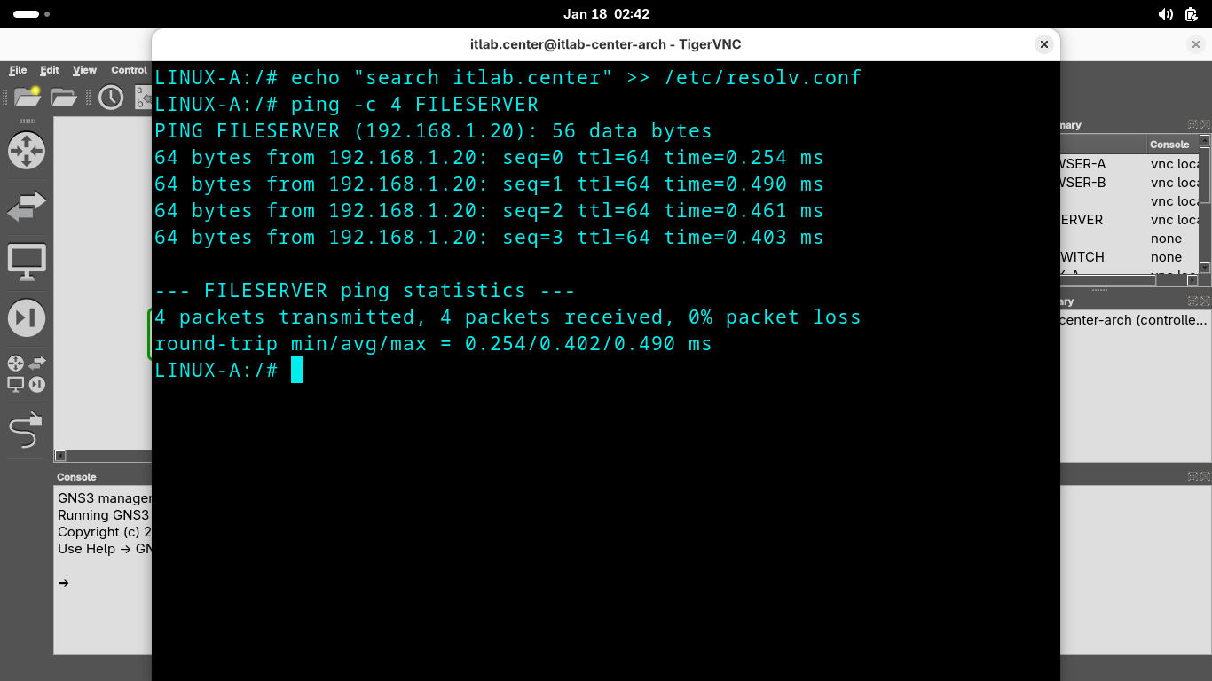 Run the following commands from the GNS3 LINUX-A Console Terminal to add a DNS search and test our ping: