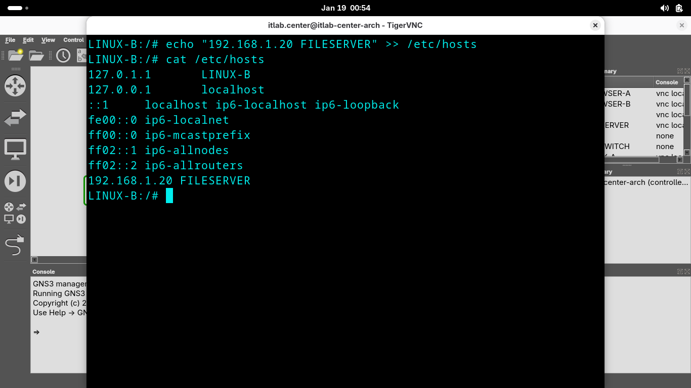 LINUX-B:/# echo "192.168.1.20 FILESERVER" >> /etc/hosts