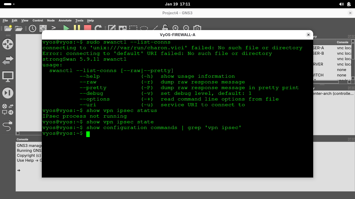 Run the following commands from the VyOS-FIREWALL-A Router Console to view the IPsec VPN configuration: