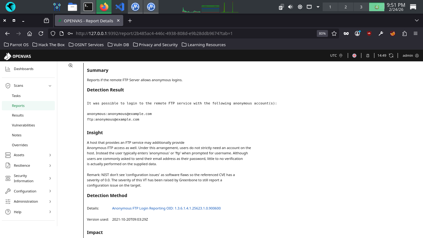 Let's check out one more, navigate back to Scans > Tasks > DebianScan Report > Anonymous FTP Login Report