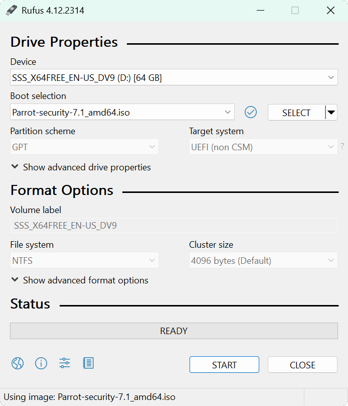 Insert USB Flash Drive, run rufus.exe, select target drive, select the Parrot OS Image, then click start: