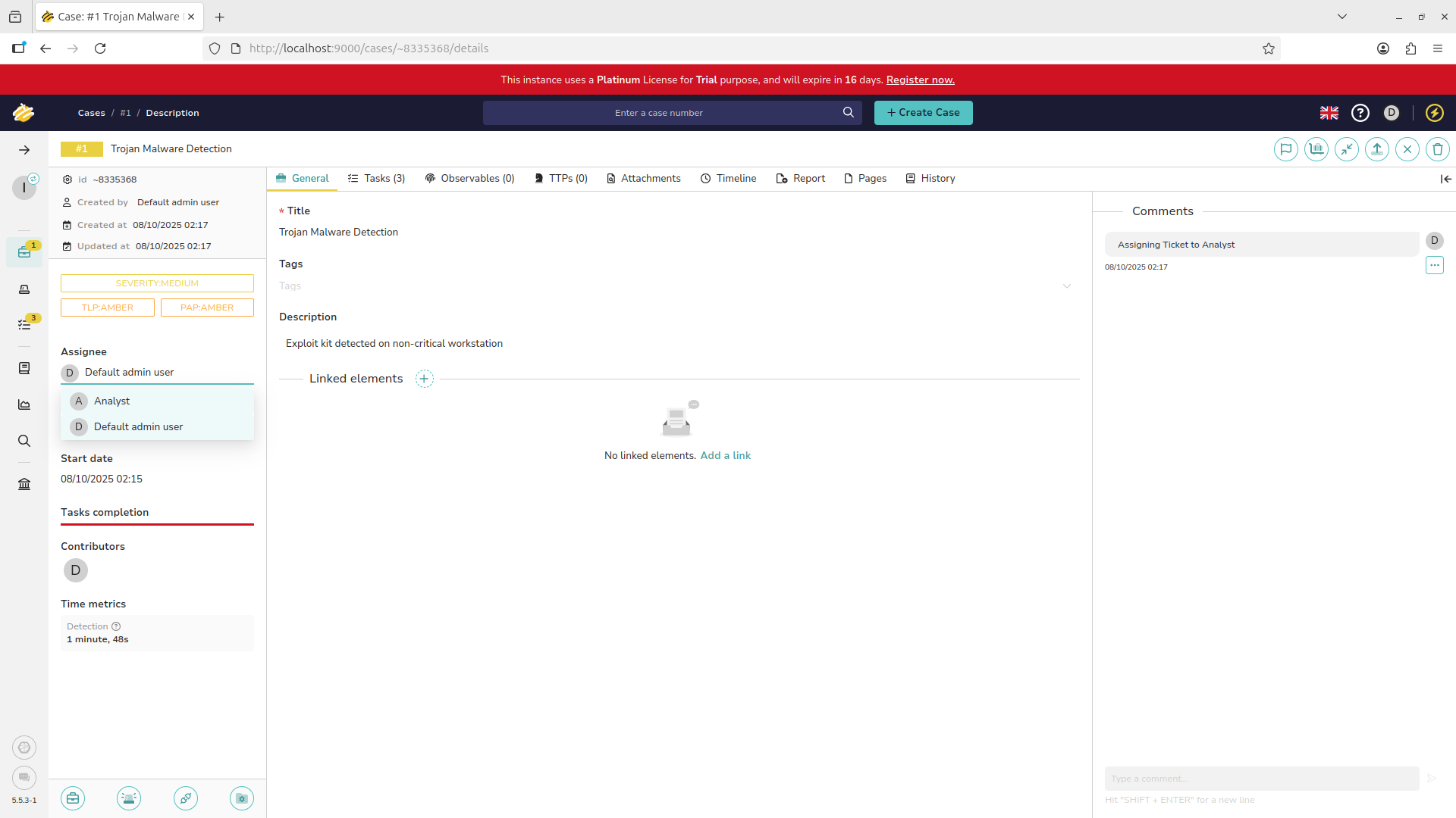 We are now shown the active case and all the data associated. Hit Assignee to assign this to our Analyst:
