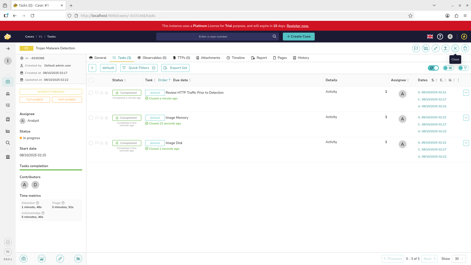 Repeat this process for each of the three assigned tasks. This case is now ready for closure, hit the X: