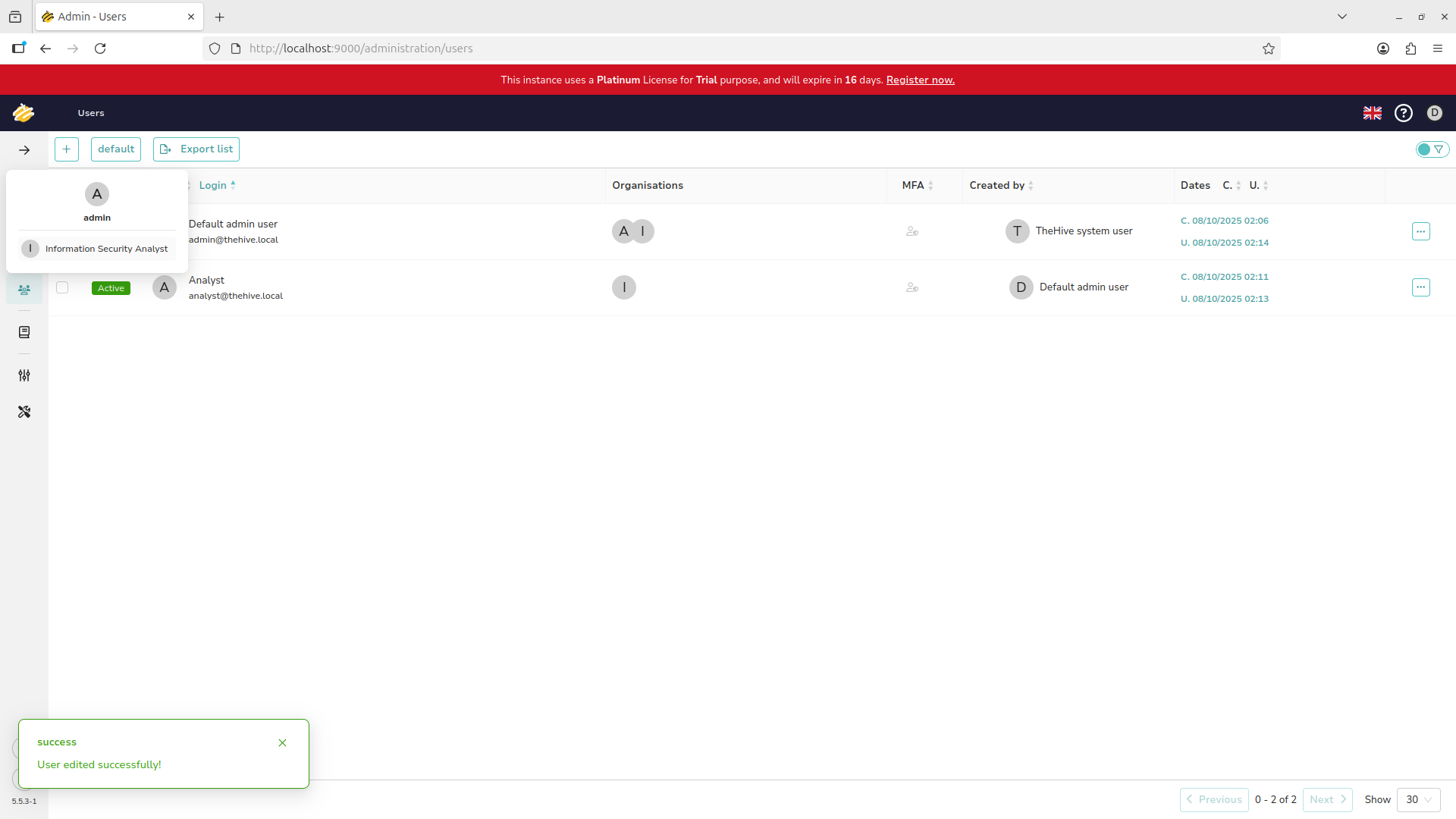 The admin account now functions as both an administrator and an analyst, we need to switch account types