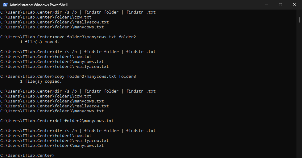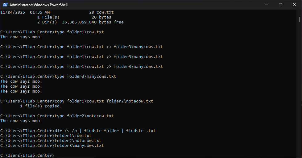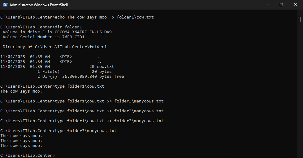 C:\Users\ITLab.Center>type folder1\cow.txt >> folder3\manycows.txt