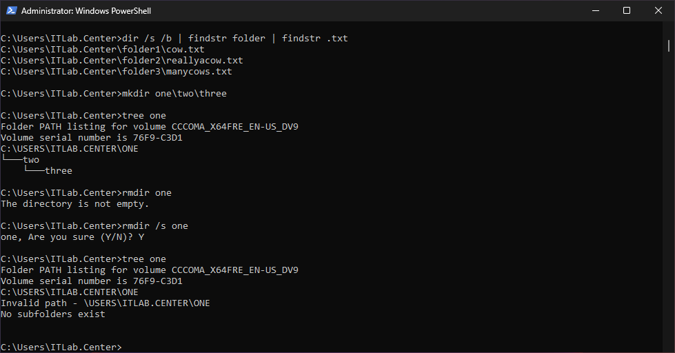 C:\Users\ITLab.Center>rmdir one