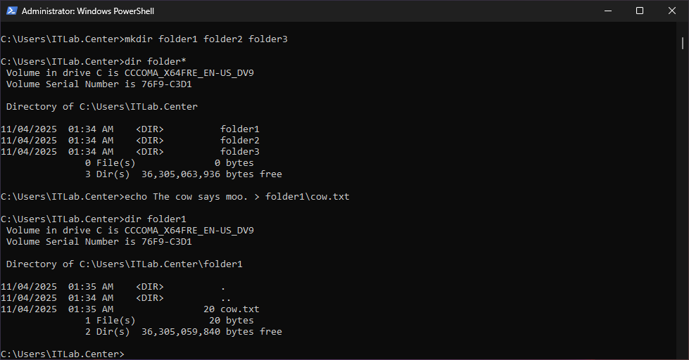 C:\Users\ITLab.Center>echo The cow says moo. > folder1\cow.txt